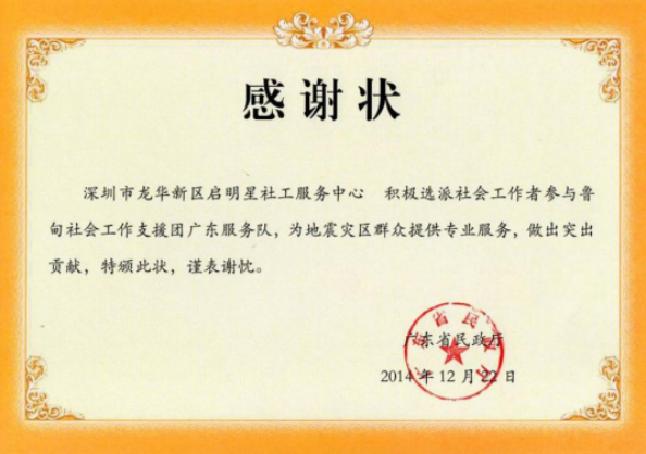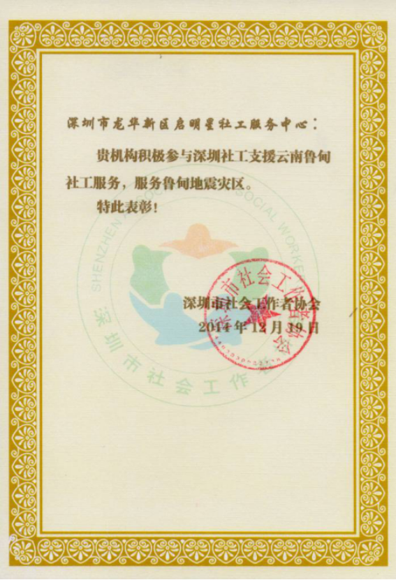 积极参与深圳社工支援云南鲁甸社工服务的特别表彰