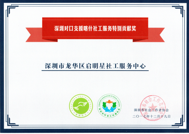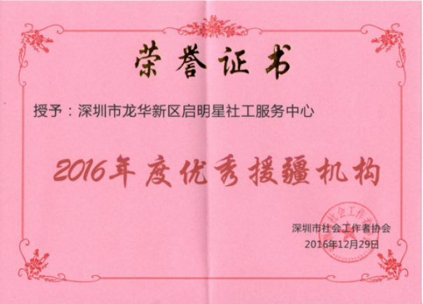 深圳市社会工作者协会颁发的2016年度优秀援疆机构荣誉证书