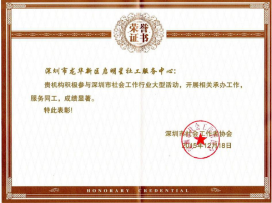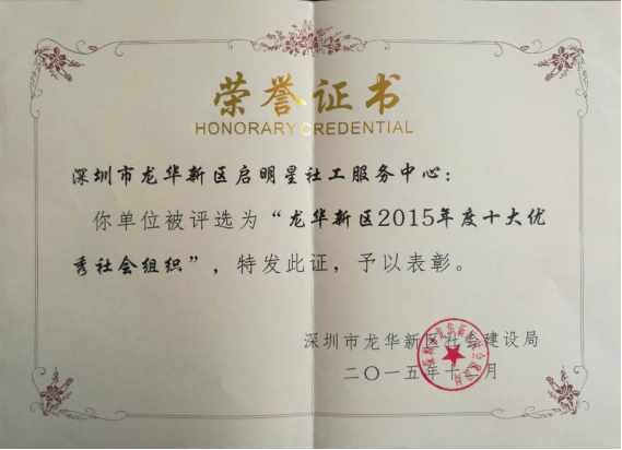 龙华新区2015年度十大优秀社会组织荣誉证书