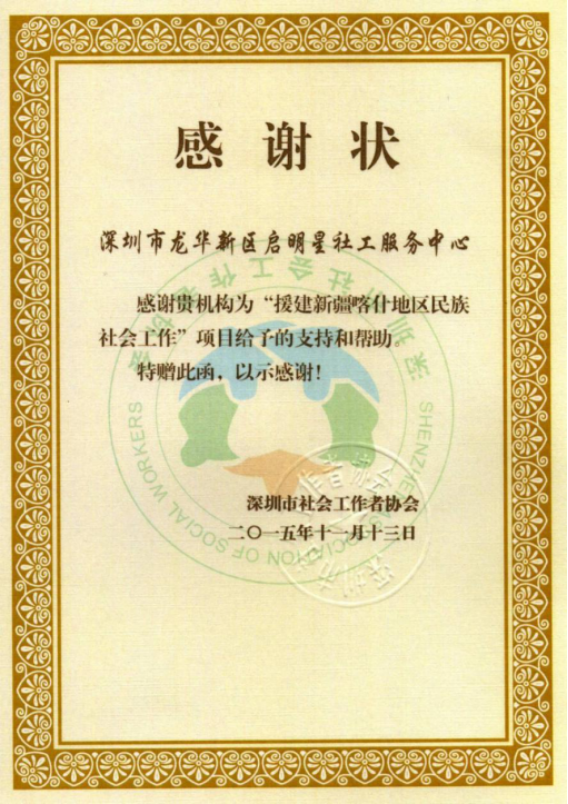 援建新疆喀什地区民族社会工作项目感谢状扫