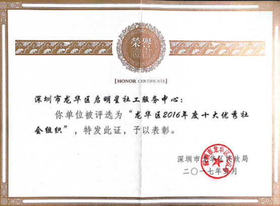 龙华区2016年度十大优秀社会组织荣誉证书