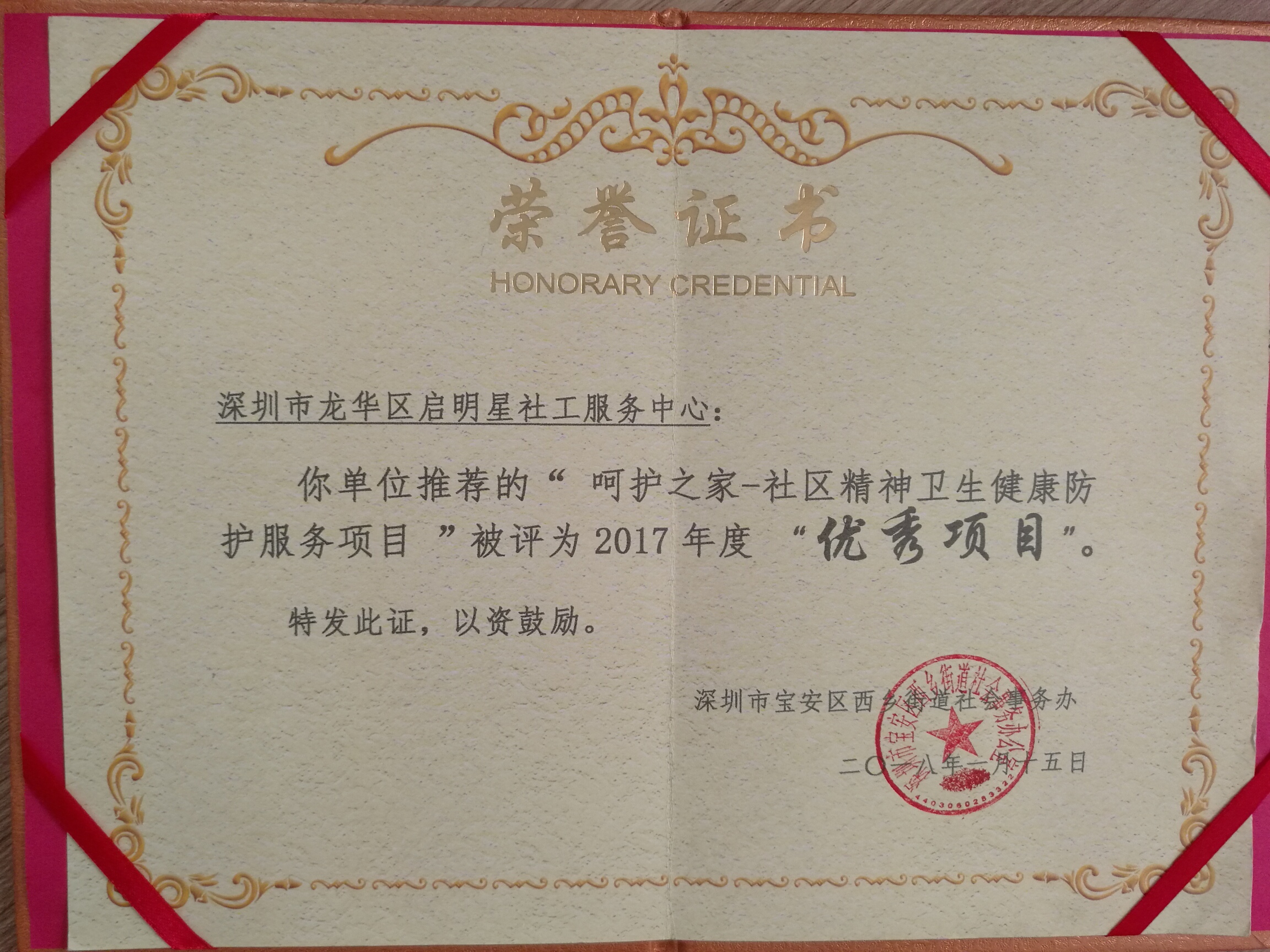 街道级:“呵护之家——社区精神卫生健康防护服务项目”——2017年优秀项目