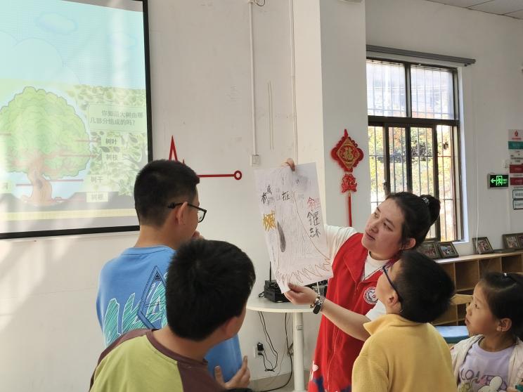 活动现场,社工借助PPT生动地向儿童介绍了“成长树”的概念——树根代表支撑自己成长的重要因素,树干代表自己的核心特质,树枝代表自己喜欢或擅长的事情,而树叶代表未来的成长目标,果实代表自己已经取得的收获。在社工的讲解和提问互动中,孩子们逐渐理解了“成长树”的意义,并开始思考自己成长过程中值得记录的内容。