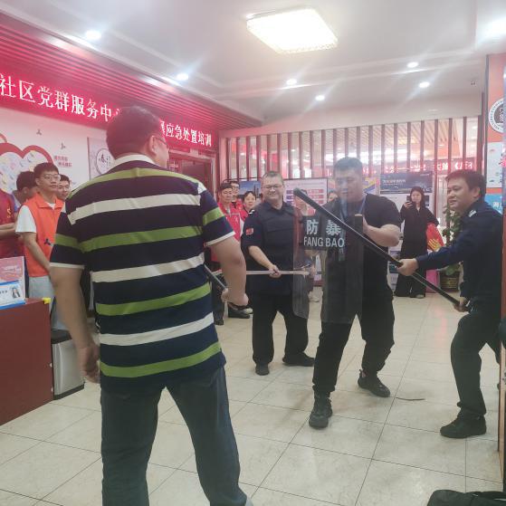 反恐防暴培训突出实战化导向,安全专家重点讲解了“盾牌防护-钢叉控制-长棍制暴”的三人战术配合要领。通过情景模拟,参训人员分组演练了“一字防御阵型”“三角合围战术”等实战技能,模拟处置了持械冲击、强行闯入等突发场景。社区工作人员李先生说:“这种沉浸式训练让我们真正掌握了器械使用技巧和团队协作要点。”