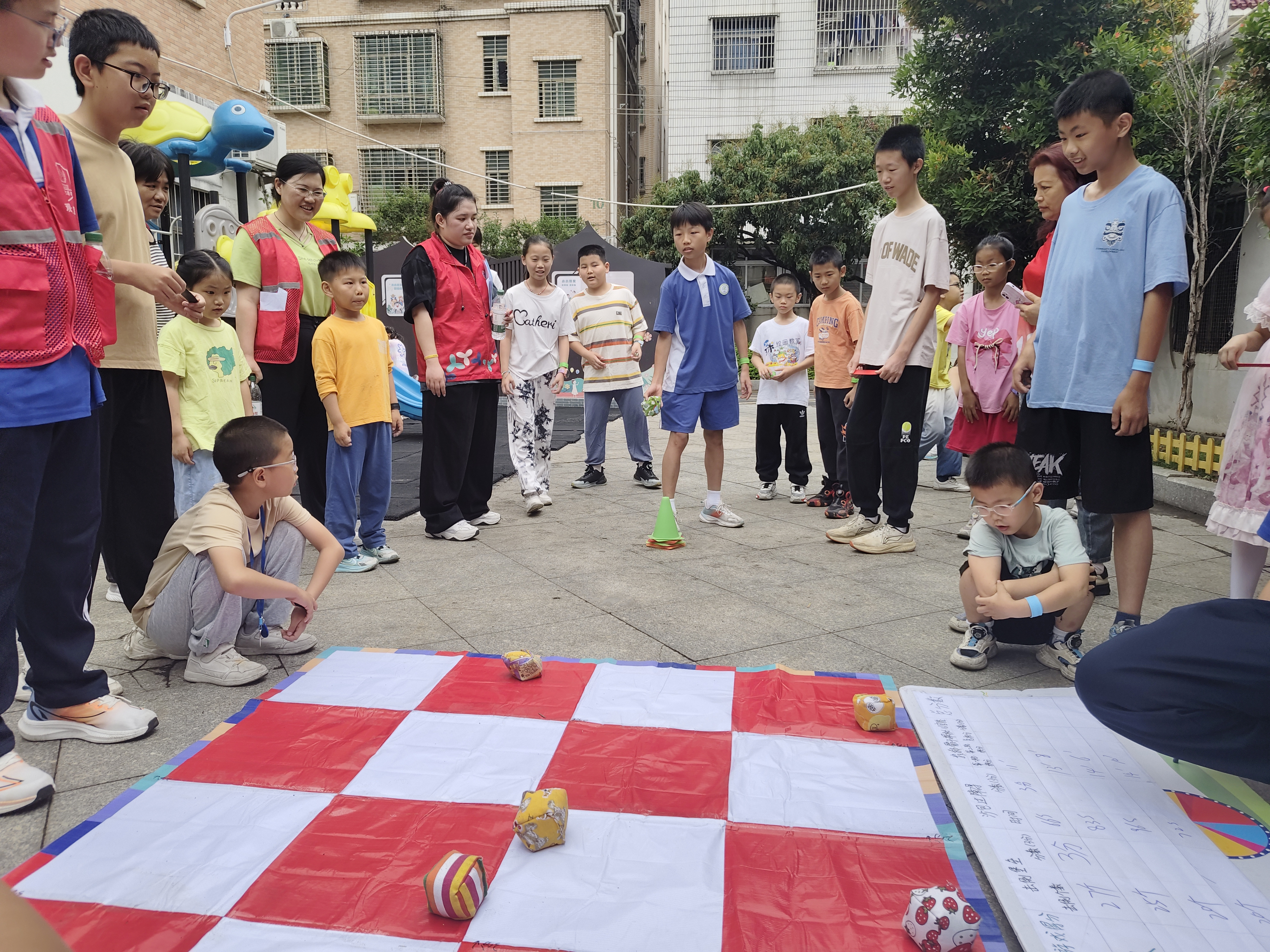 “沙包过障”环节则考验速度与技巧的完美融合,小朋友们需要头顶沙包,在前进的过程中精准绕过障碍物并迅速返回与下一位队友击掌接力。赛道上,孩子们身姿矫健,保持平衡持续前进,大家齐心协力,为小组的荣誉全力以赴,现场加油声、欢呼声此起彼伏。最后的“投掷 16 宫格获取积分”环节更是策略与运气的精彩博弈。在指定距离外,每人拥有 2 个沙包,需在两轮投掷中争取最高积分。