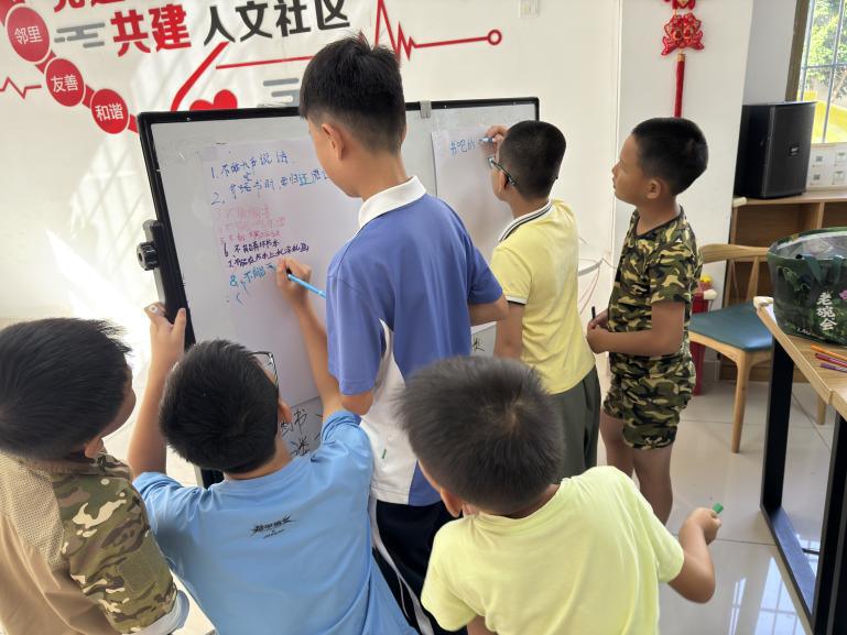 整理完成后,社工引导社区儿童制定《阅读区小公约》,公约包括保持安静、爱护书籍、不吵闹、看完归位等内容,并提议张贴在阅读区醒目位置。