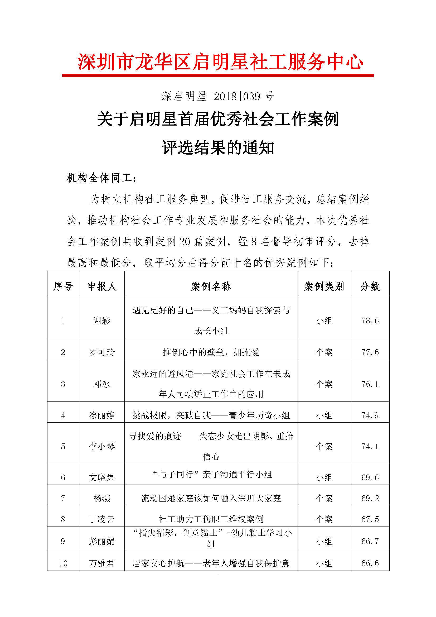 深启明星[2018]039号-关于启明星首届优秀社会工作案例评选结果的通知