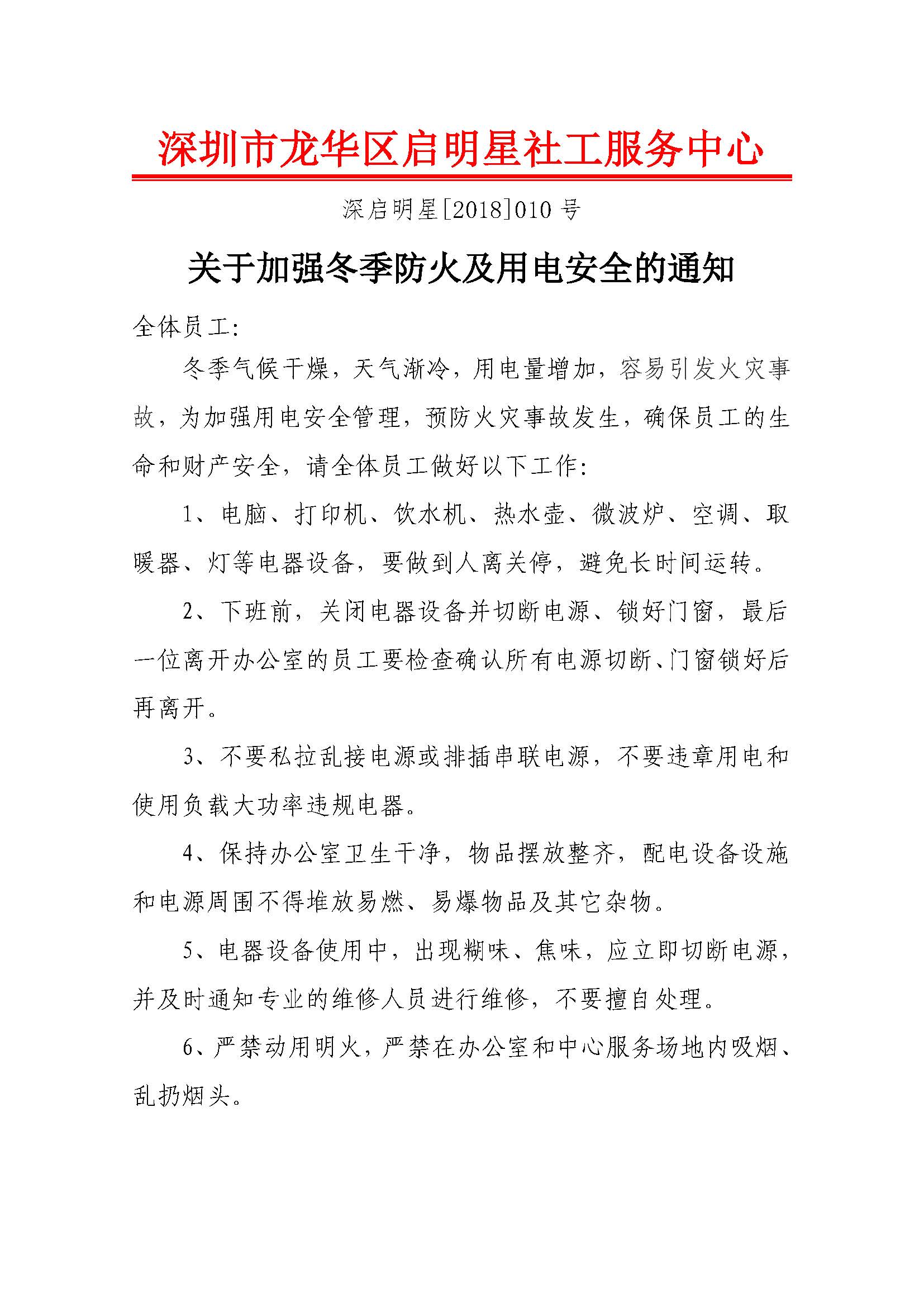 深启明星[2018]010号-关于加强冬季防火及用电安全的通知