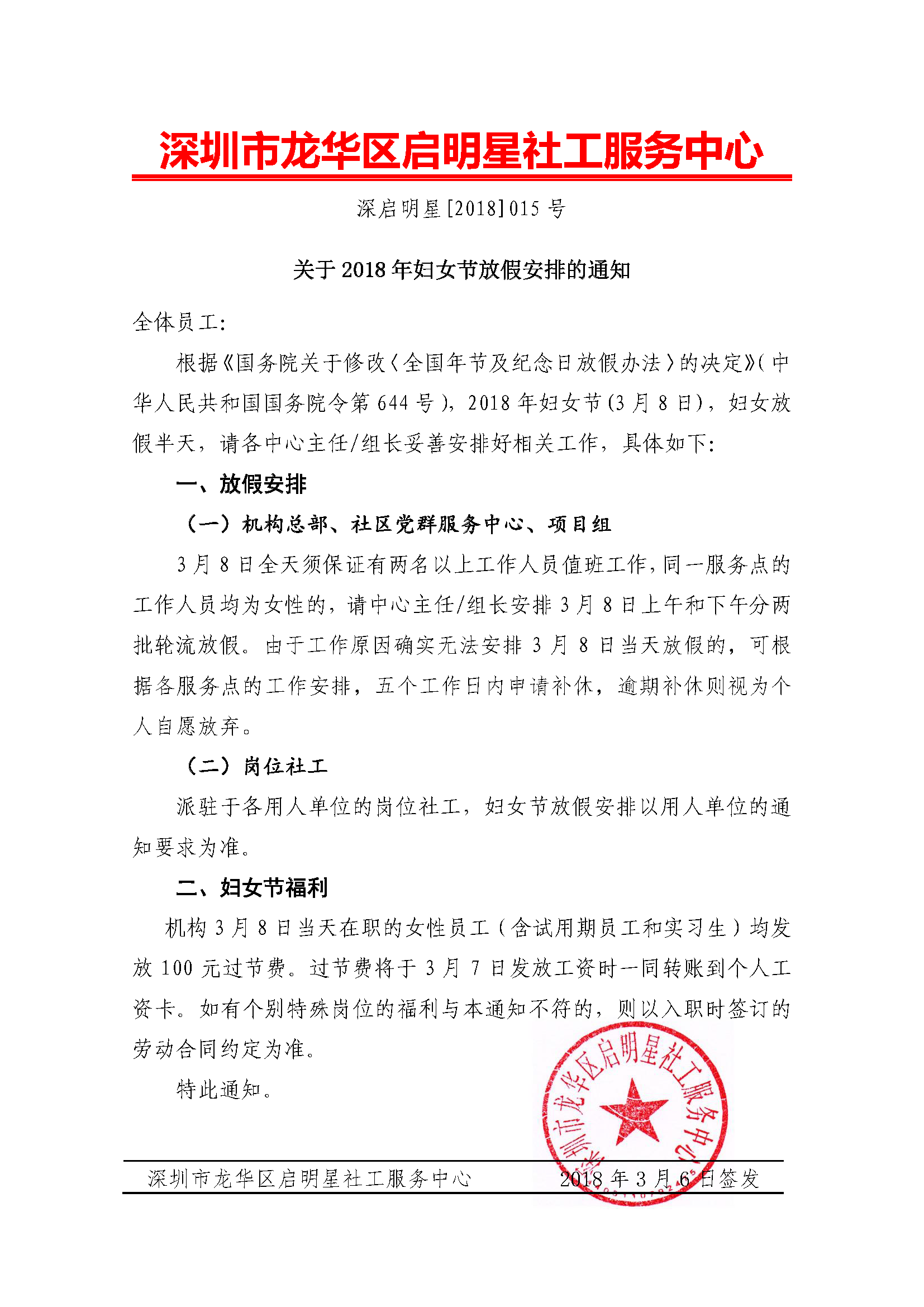 深启明星[2018]015号-关于2018年妇女节放假安排的通知