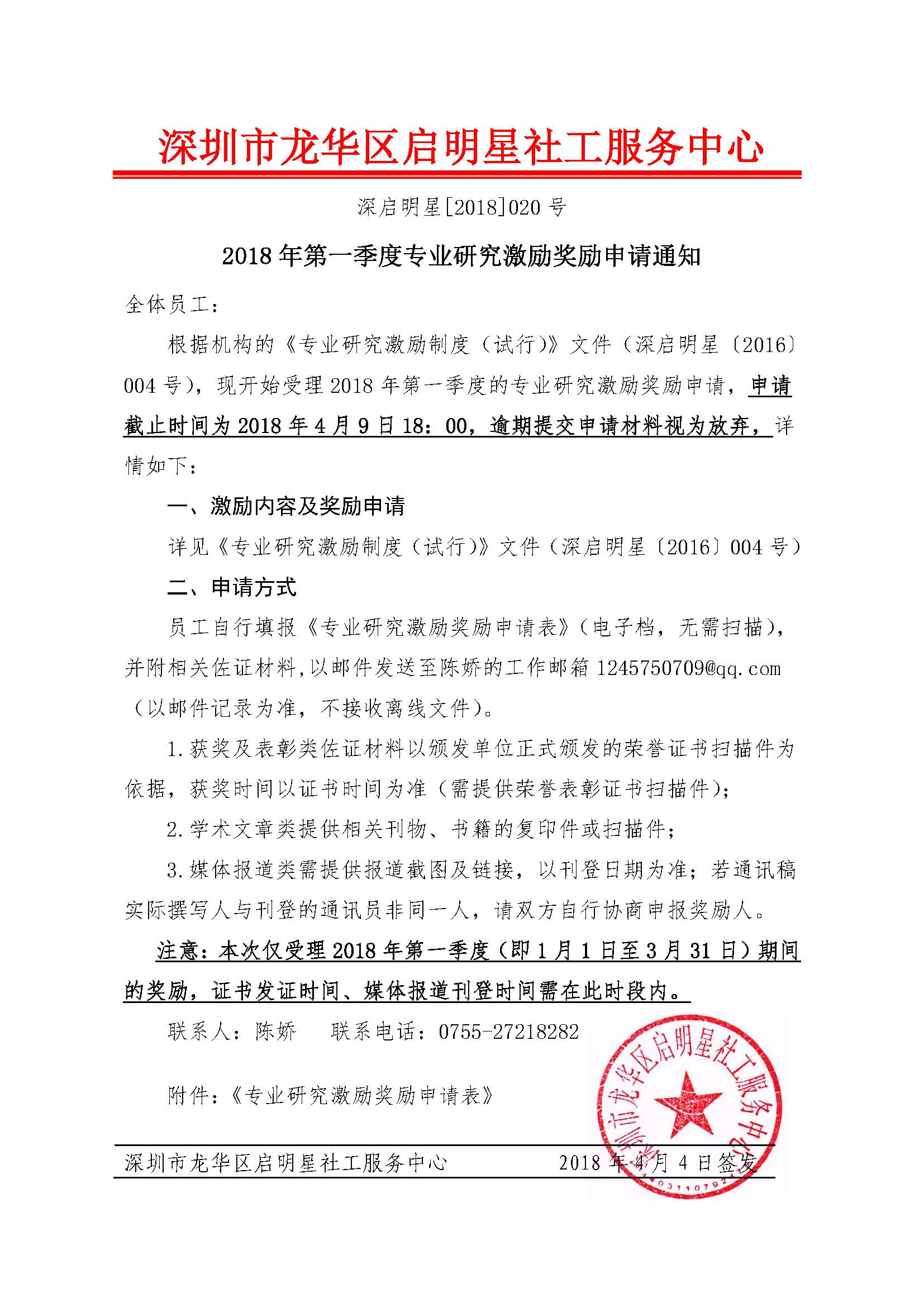 深启明星[2018]020号-第一季度专业研究激励奖励申请通知