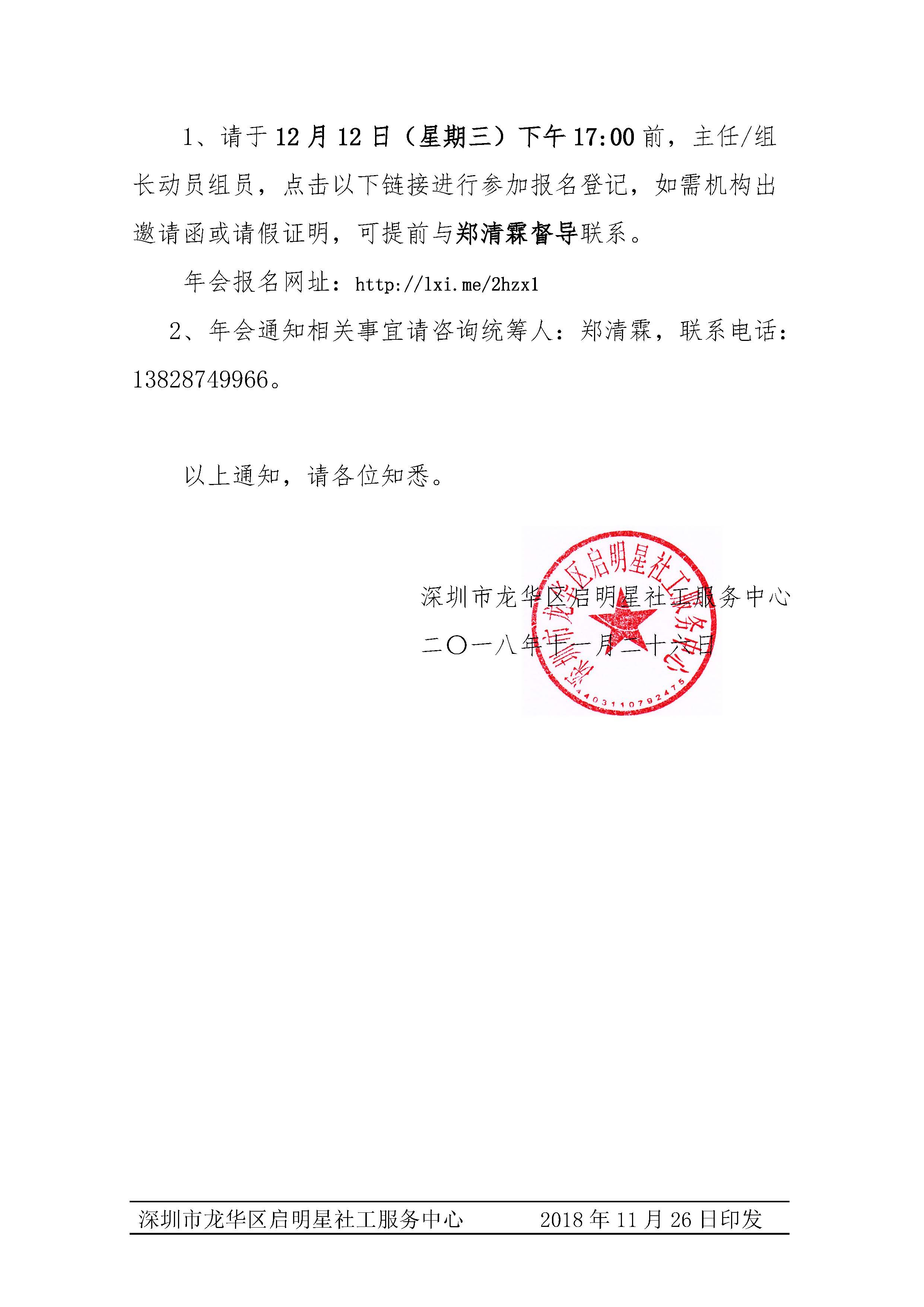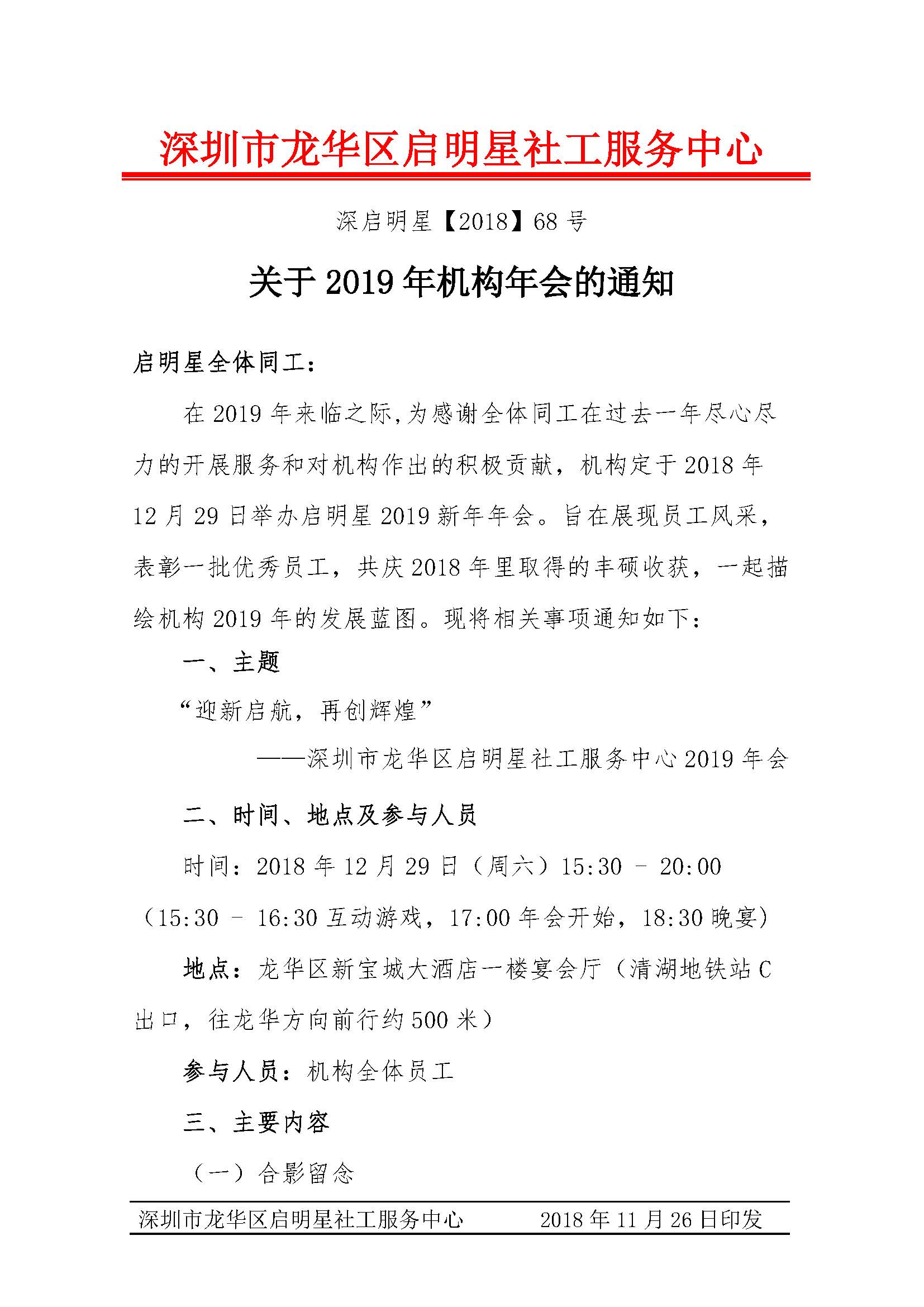 深启明星[2018]068号-关于2019年深圳市龙华区启明星社工服务中心年会通知