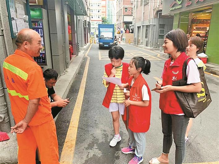 2 宝安塘头小志愿者向环卫工人咨询社区中的不环保行为及对社区居民的寄语。