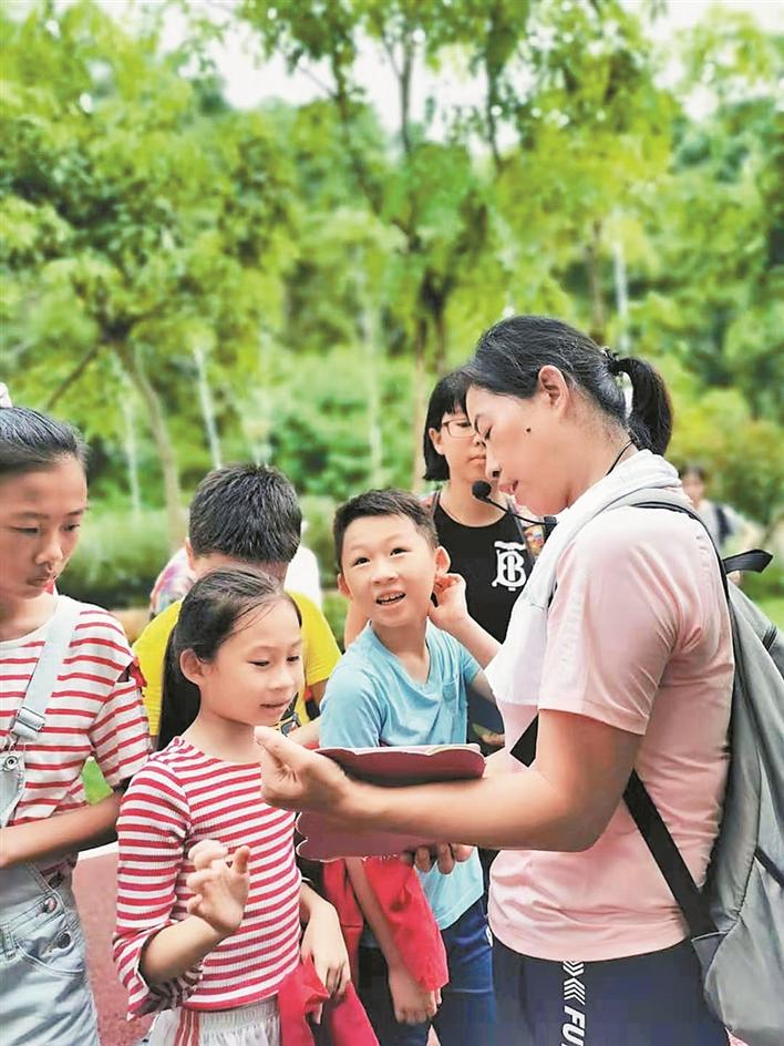 5 罗湖分部助管卢小燕为小志愿者讲解翠湖社区公园内的植物。