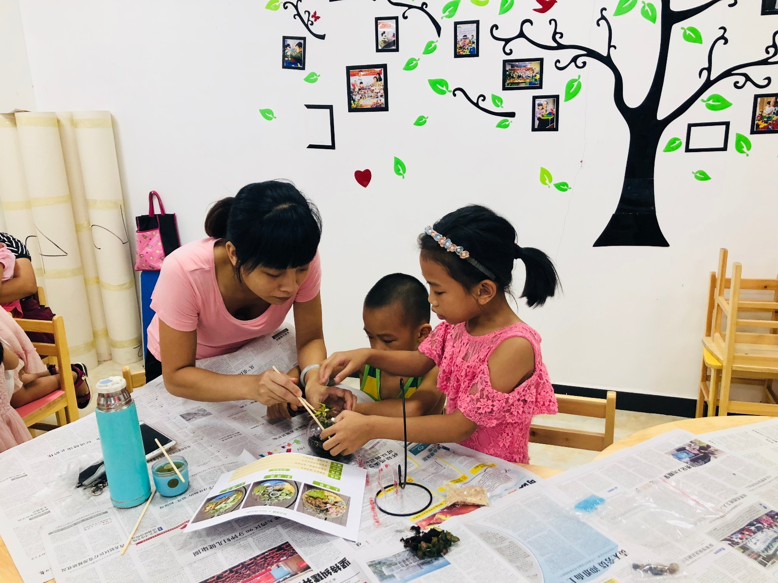 据了解,当天的活动开始时,社工将铁吊环、玻璃瓶、种植土壤、绿植、青苔及种植工具等一一发到每对亲子手中,引导参加者们围绕雨季、流水、游玩等主题进行创作。所有的亲子拿到材料之后,迫不及待的动手,开始制作奇妙的微景观世界。