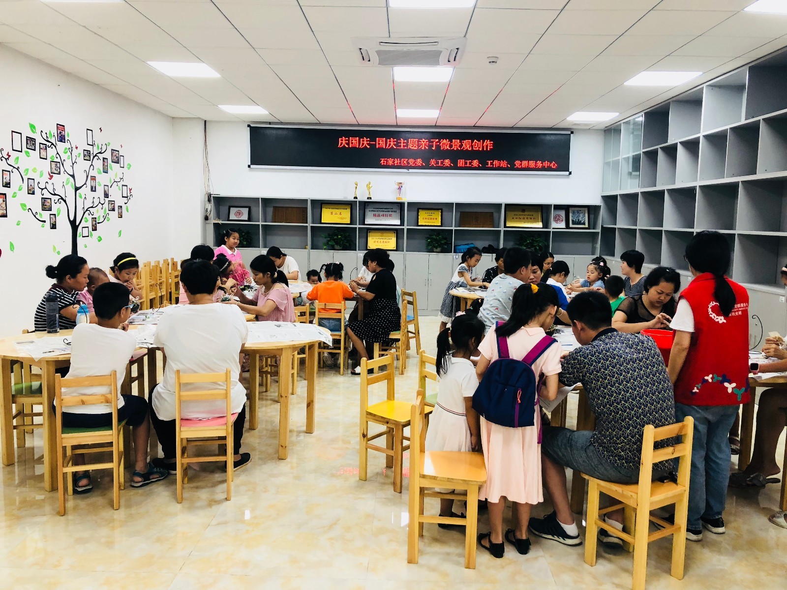 近日,马田街道石家社区党委联合辖区工作站、关工委,在社区党群服务中心活动室开展了“庆国庆主题亲子微景观创作”活动,吸引15对亲子报名参加。