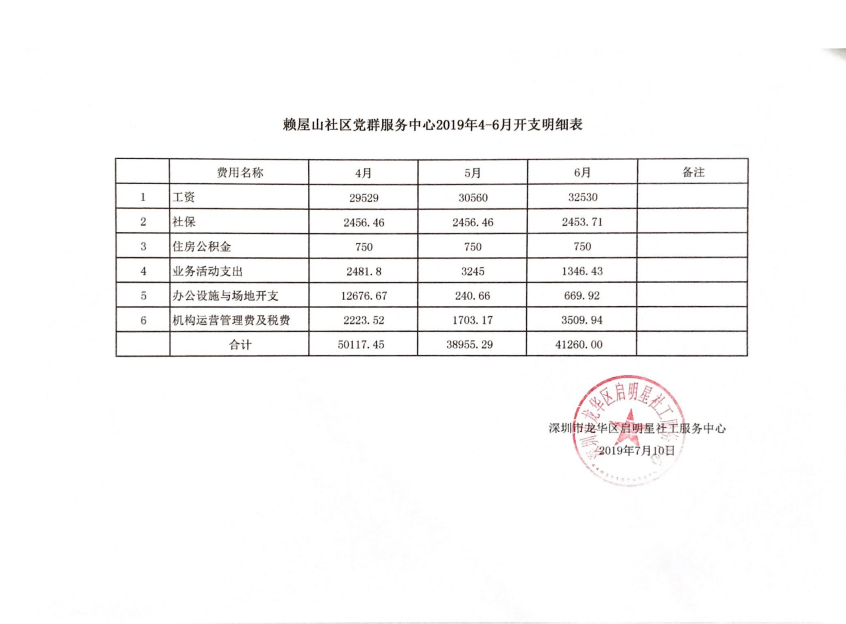 赖屋山社区党群服务中心第二季度财务公示