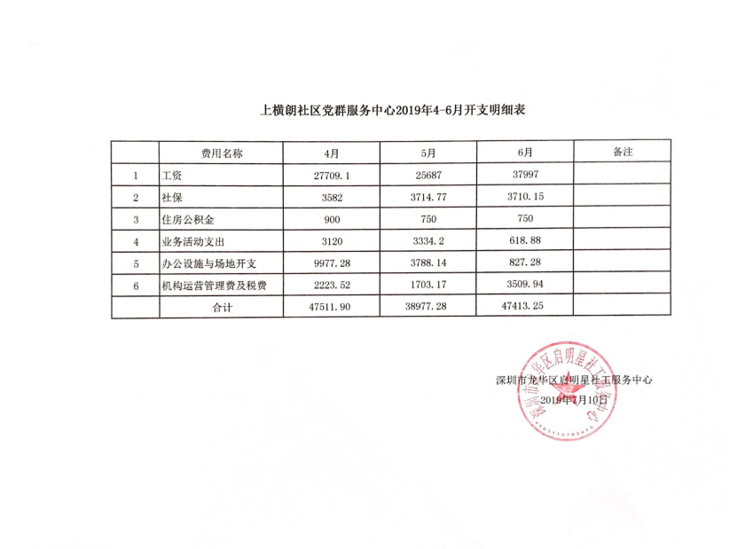 上横朗社区党群服务中心第二季度财务公示