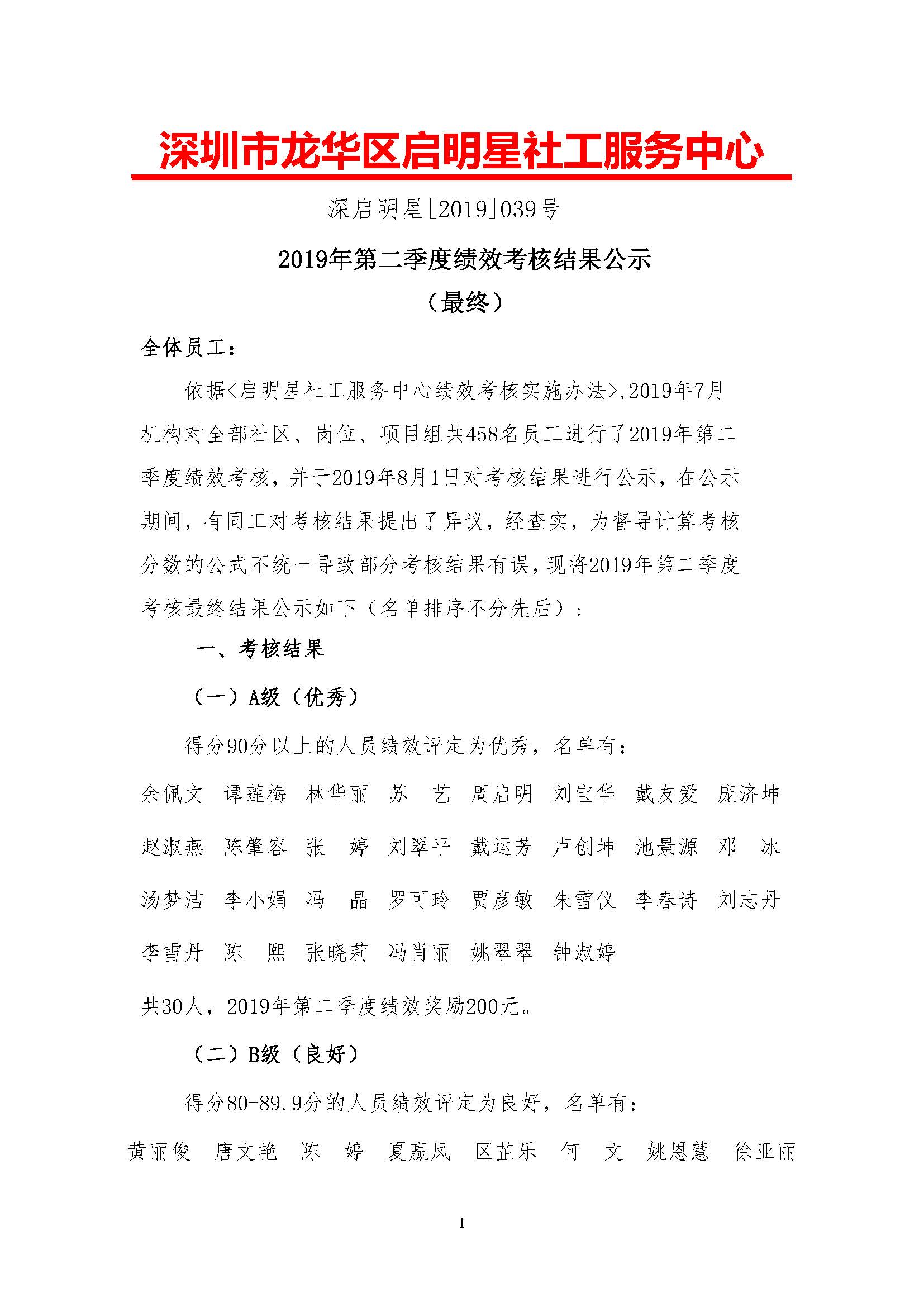 深启明星[2019]039号-2019年第二季度绩效考核结果公示