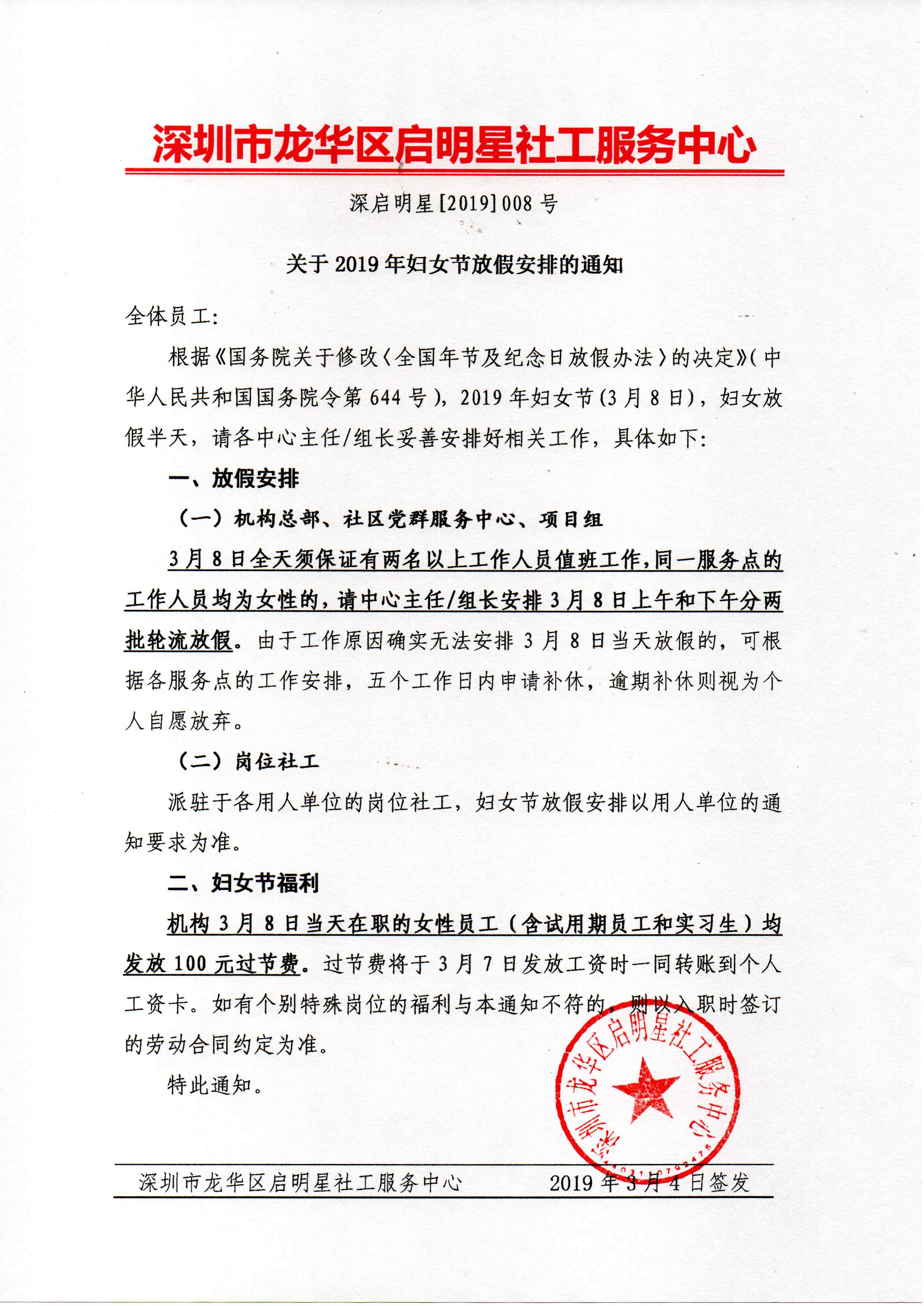 深启明星[2019]008号-关于三八妇女节放假安排的通知