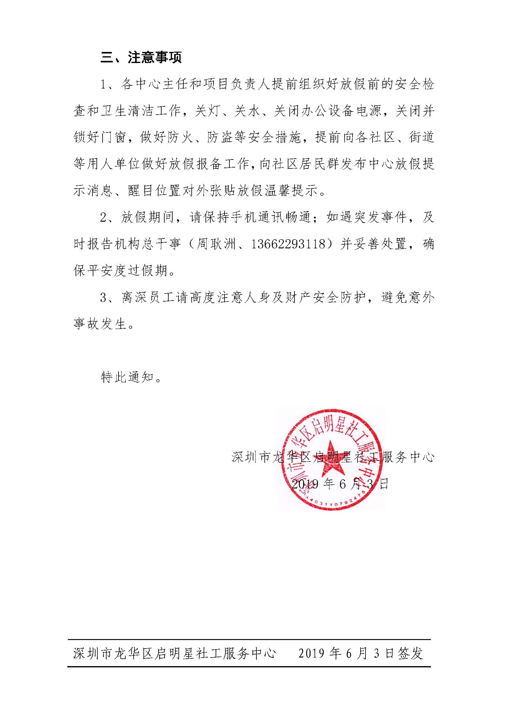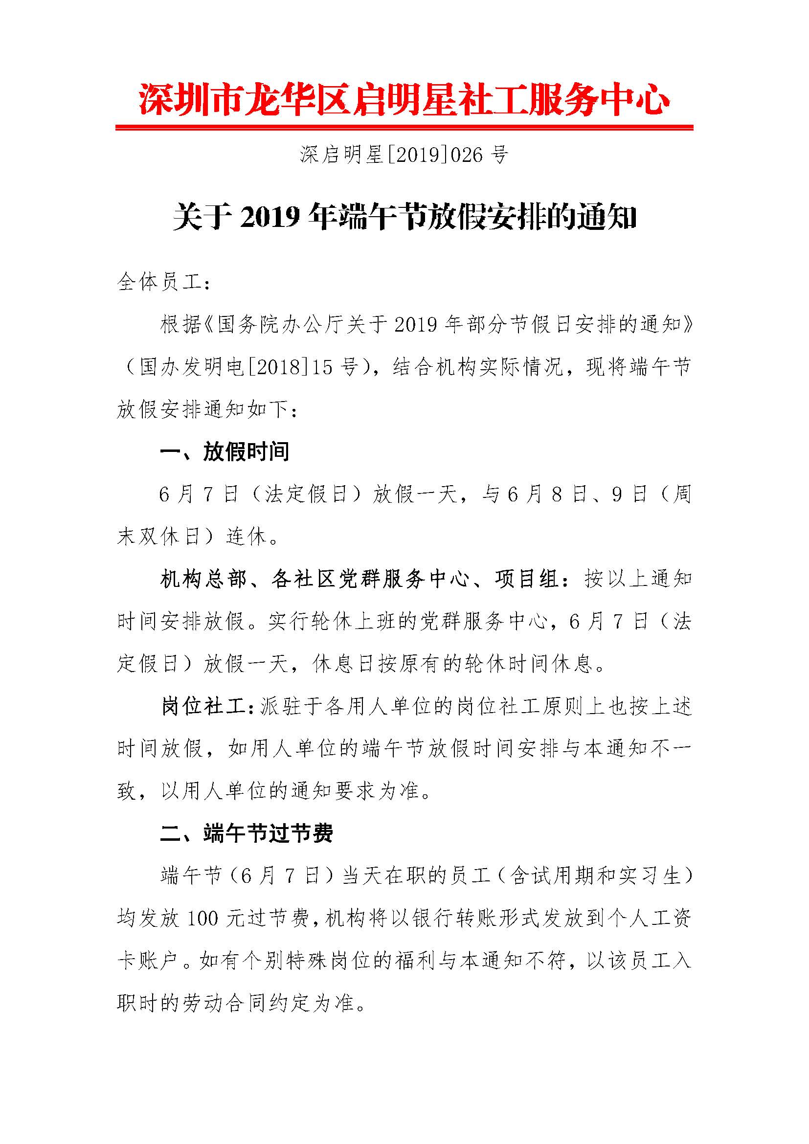 深启明星[2019]026号-关于2019年端午节放假安排的通知