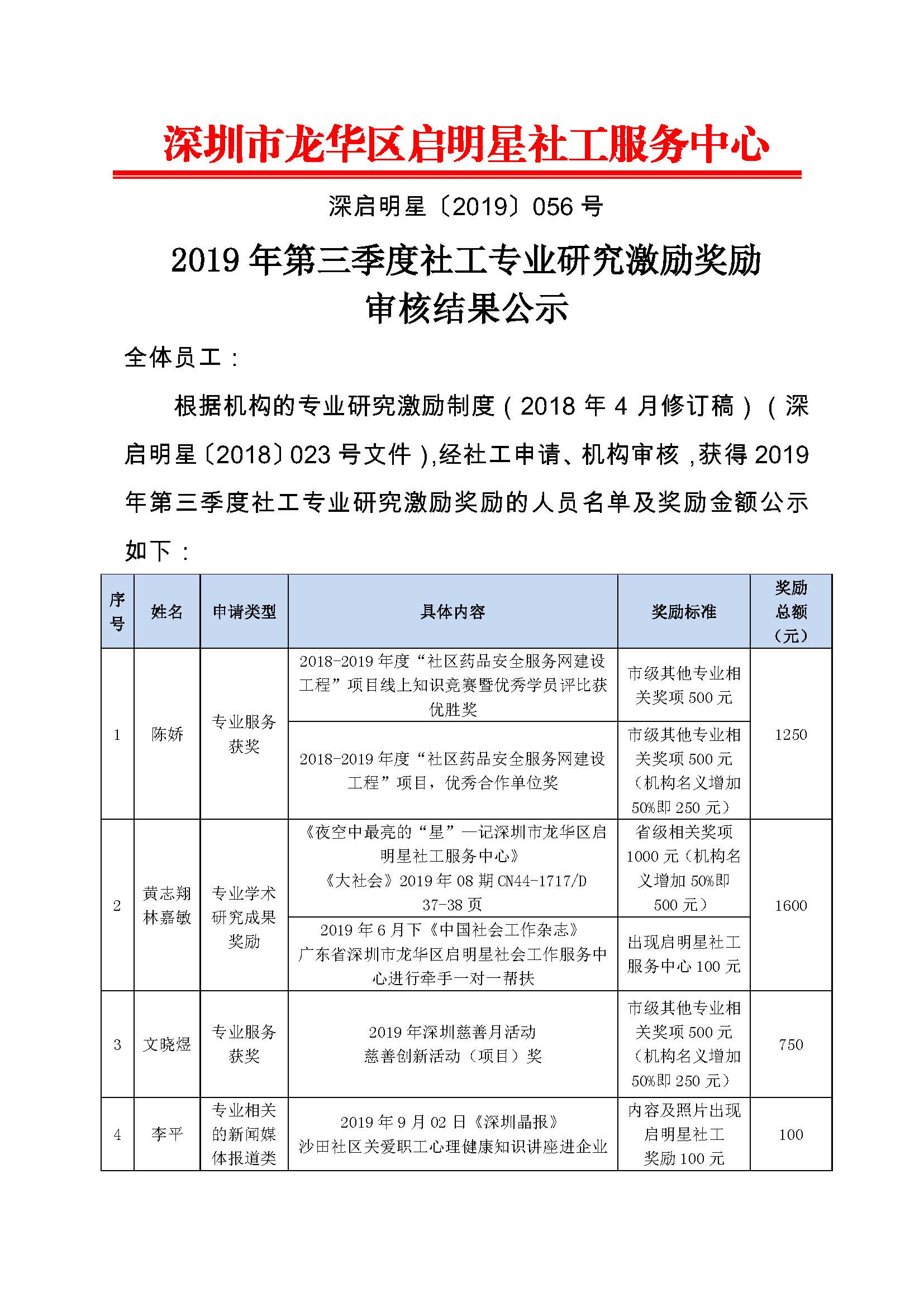 深启明星[2019]056号-2019年第三季度社工专业研究激励奖励审核结果公示