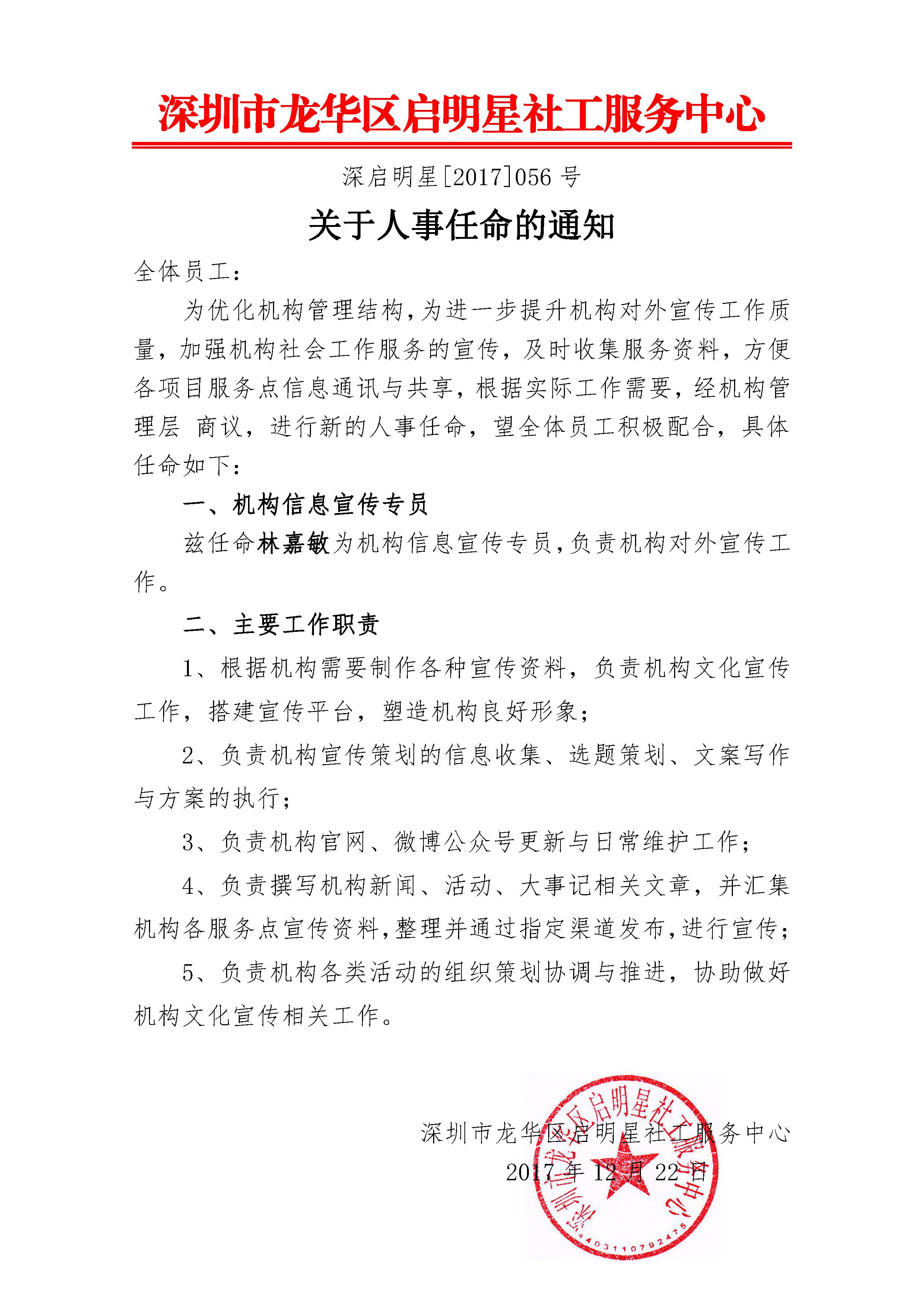 深启明星[2017]056号关于人事任命的通知