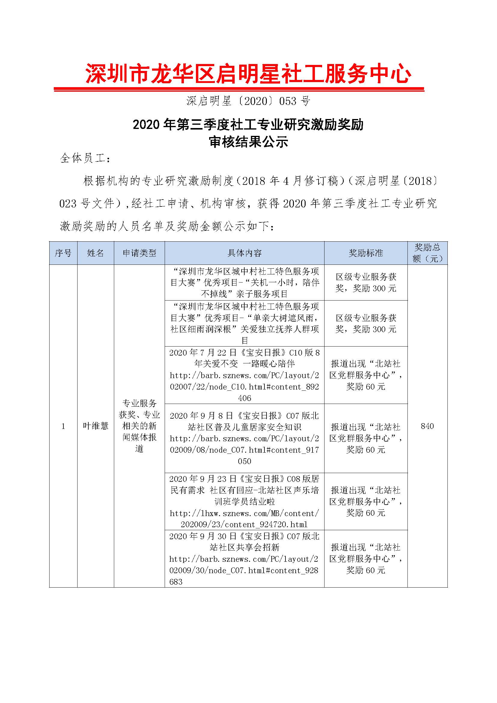 深启明星[2020]053号-2020年第三季度社工专业研究激励奖励审核结果公示