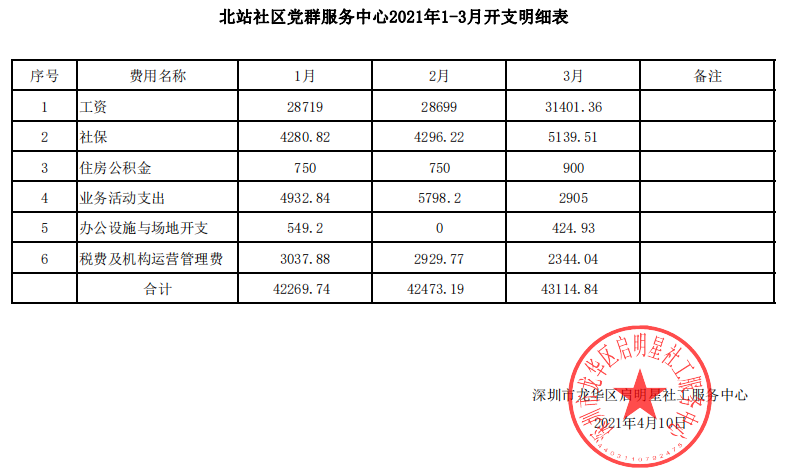 北站社区2021年第一季度财务公示