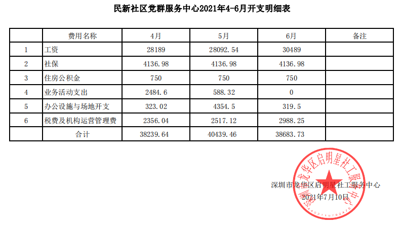 民新社区2021年第二季度财务公示