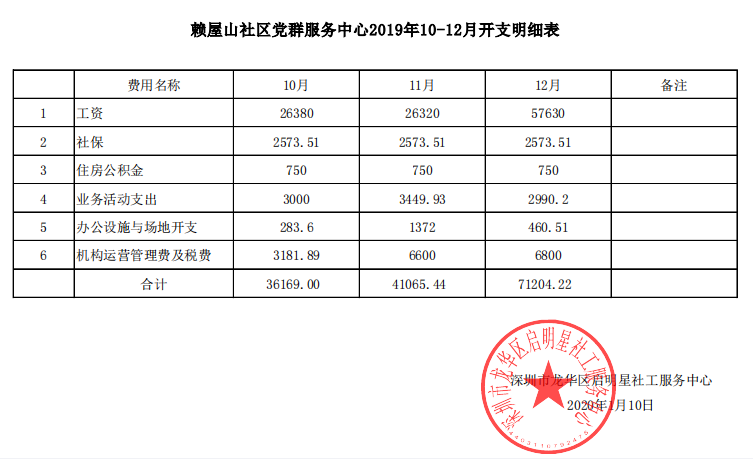 赖屋山社区2019第四季度财务公示