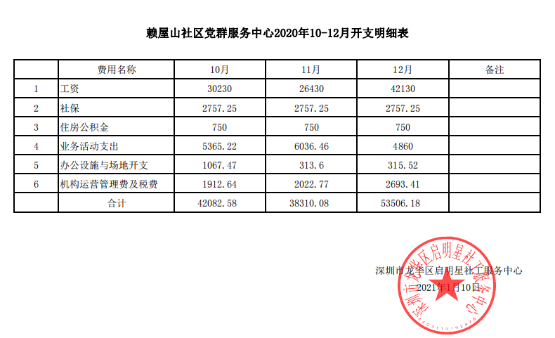 赖屋山社区2020第四季度财务公示