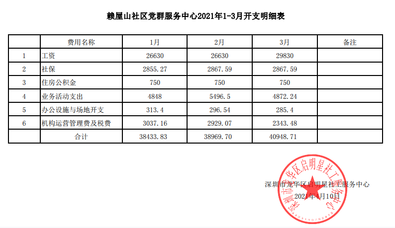 赖屋山社区2021第一季度财务公示