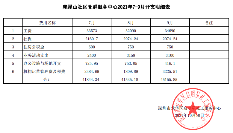 赖屋山社区2021第三季度财务公示