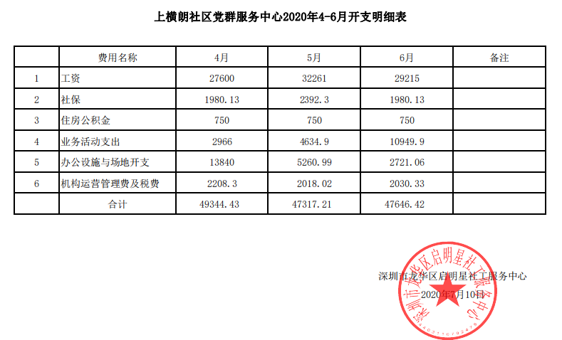 上横朗社区2020年第二季度财务公示