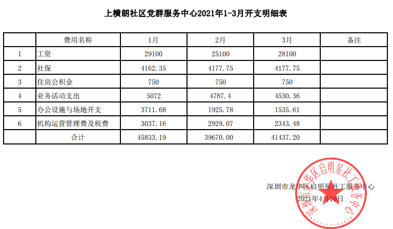 上横朗社区2021年第一季度财务公示