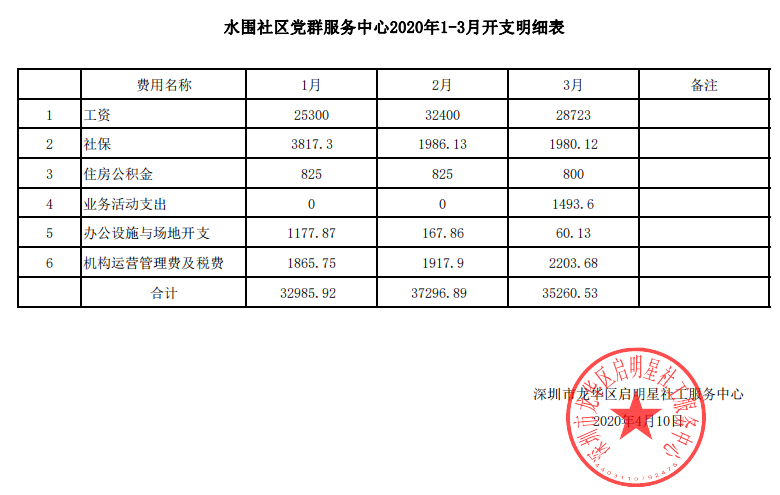 水围社区2020年第一季度财务公示
