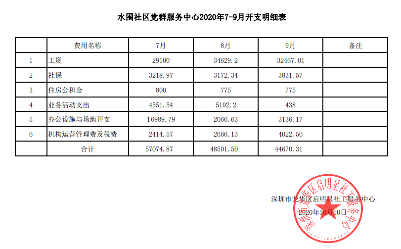 水围社区2020年第三季度财务公示