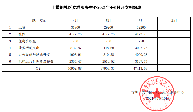 上横朗社区2021年第二季度财务公示