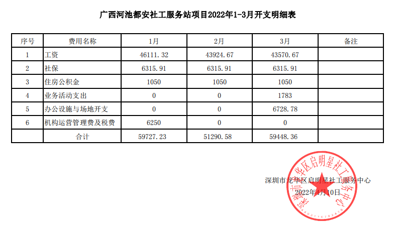 广西河池都安社工服务站项目2022年第一季度财务公示